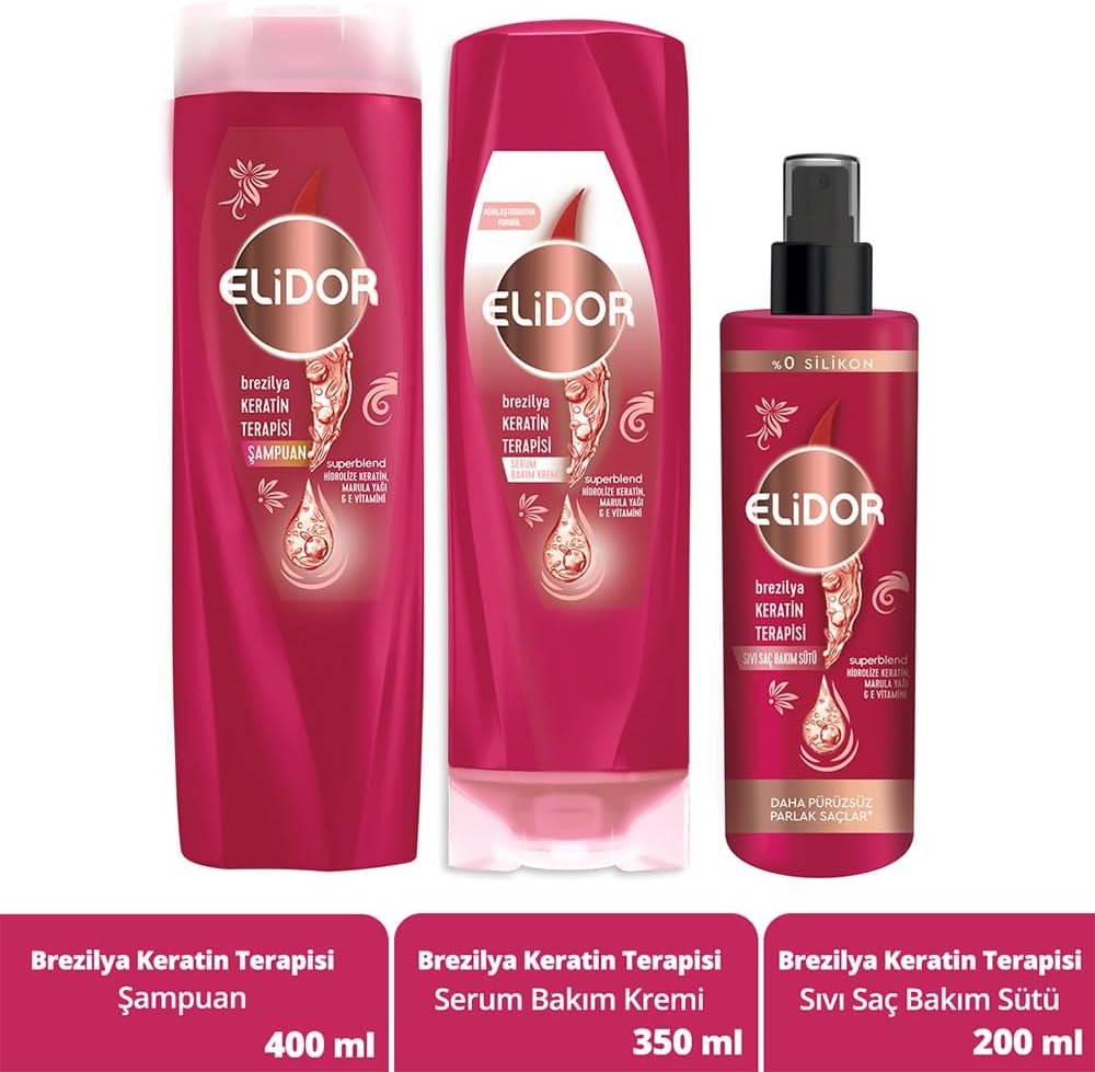 Elidor Brazil Keratin Therapy Shampoo 400 ml + Elidor Brazil Keratin Therapy Serum Care Cream 350 ml + ELIDOR KERATIN LIQUID MAINTENANCE SILK SILK SILVER 200ML