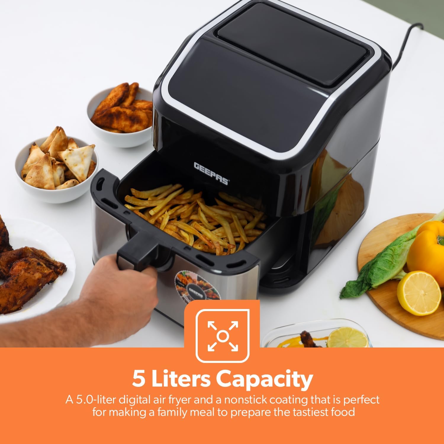 - LARGE CAPACITY: A 5.0-liter digital air fryer and a nonstick coating that is perfect for making a family meal to prepare the tastiest food and snacks without oil and up to 80% less fat. It is ideal for cooking perfectly cooked, healthy, low-fat food without oil for the entire family.