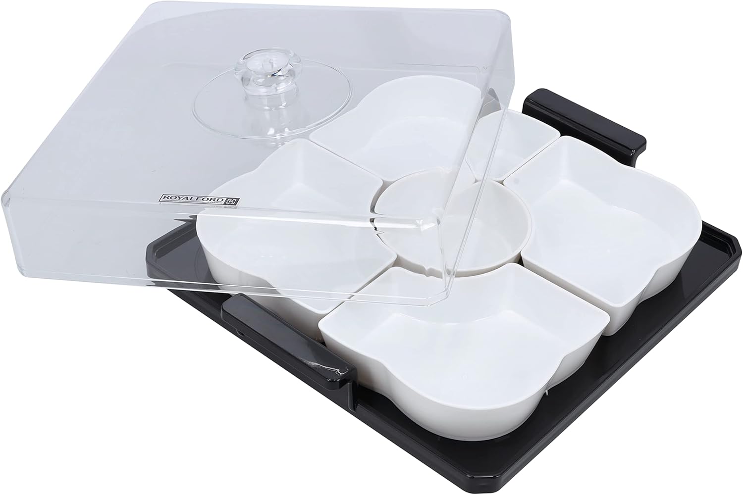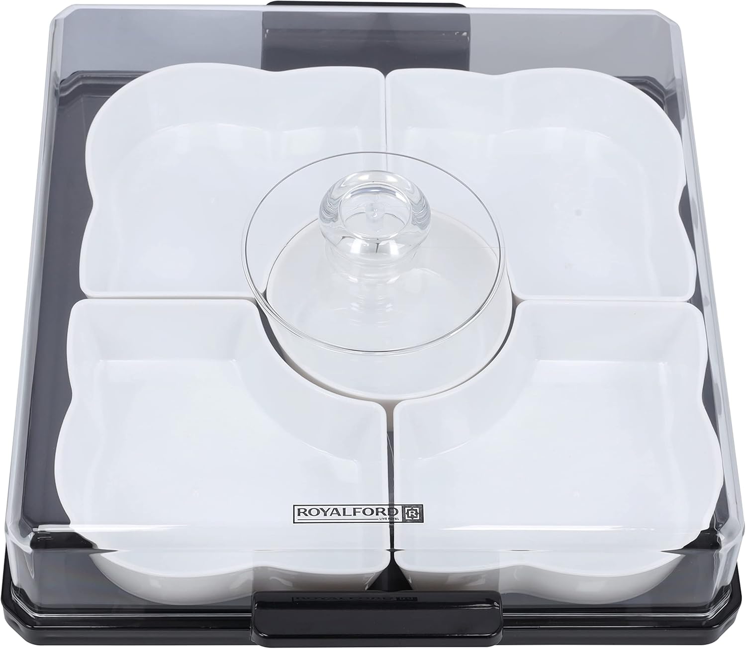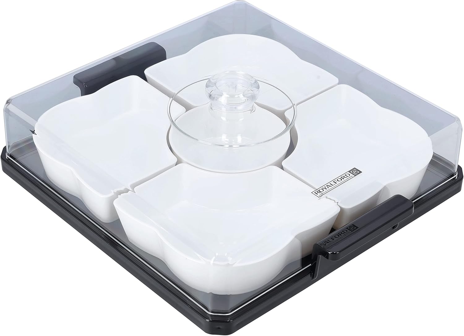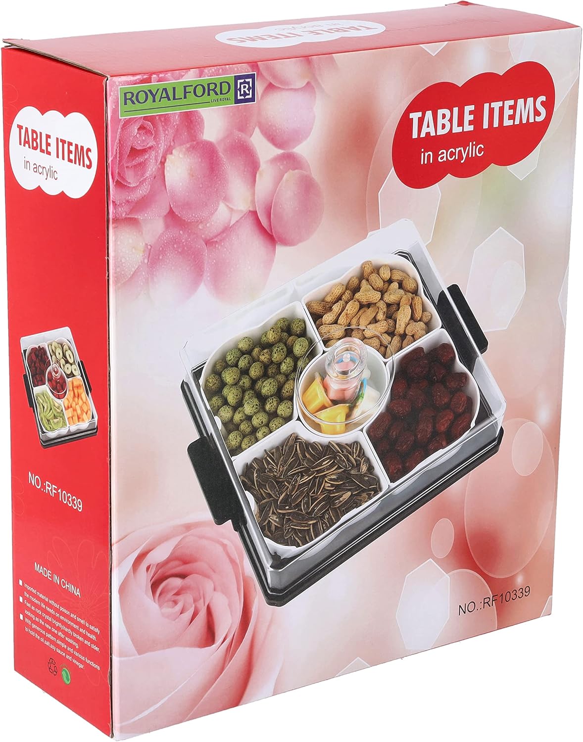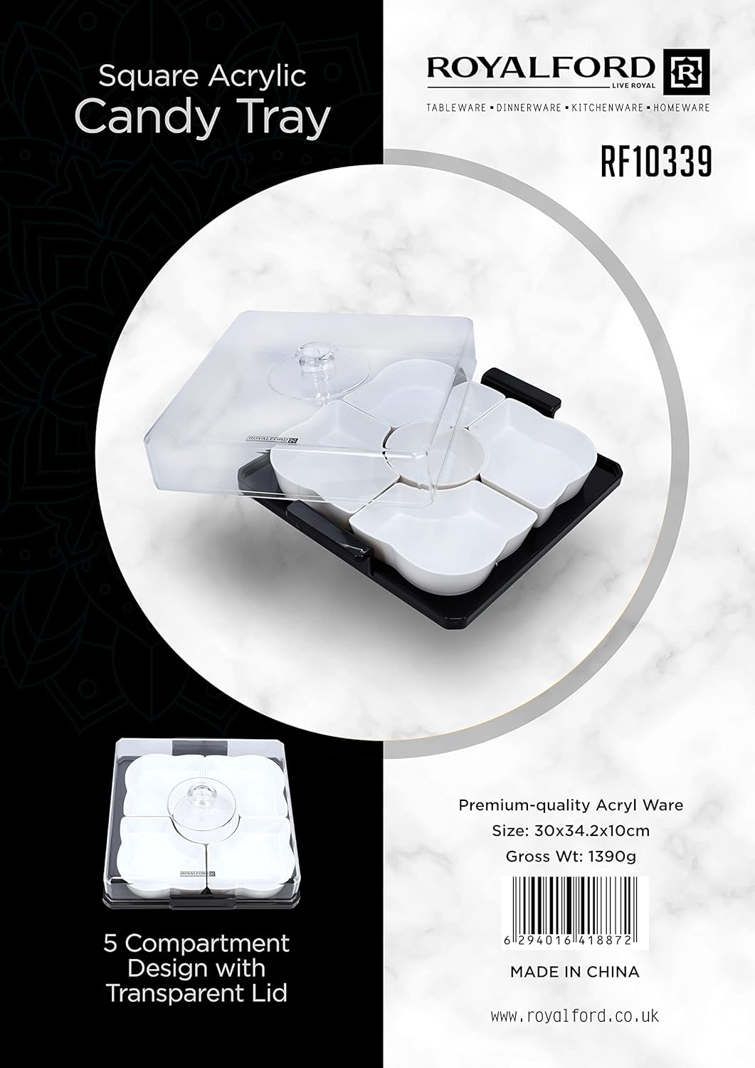 - MAKES A BEAUTIFUL CENTERPIECE – This Royalford Acrylic square Candy tray with white and black finished certainly makes a statement with its lovely 5 Compartment Design with Transparent Lid. It will add elegance and refinement to any space it occupies. Put it in your kitchen or office for a lovely candy display. It elevates your desserts and sweets, showing them off and creating more space on your desk, table, or countertop.